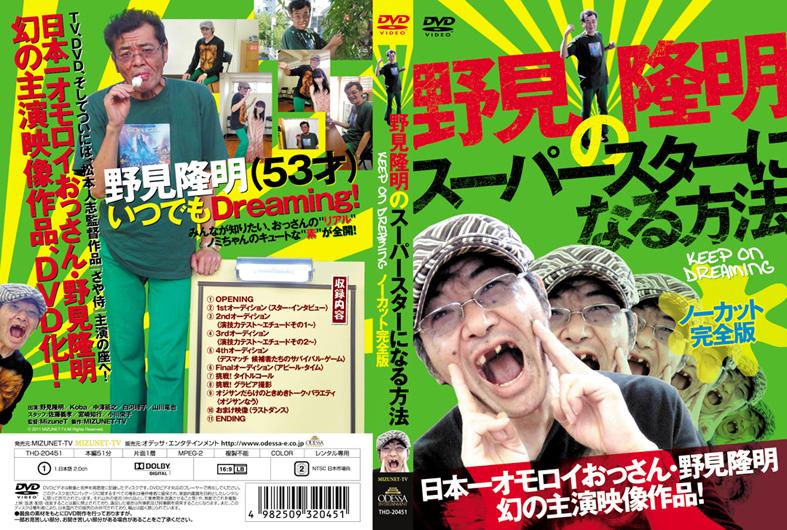 松本人志監督作『さや侍』の主演を務める日本一オモロイおっさん・野見隆明が出演した幻の映像作品をDVD化。赤裸々な過去を語るインタビュー、演技テスト、アピールダンスなどのオーディション風景に加え、オフショットやグラビア映像なども収録。